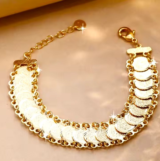 سوار سلسلة العملات الأفريقية المطلي بالذهب هو قطعة مجوهرات أنيقة ومميزة، تجمع بين التصميم العصري واللمسات التراثية المستوحاة من الثقافة الأفريقية. هذا السوار يعد خيارًا مثاليًا لمن يبحث عن إكسسوار فريد من نوعه يضيف لمسة من الجمال الكلاسيكي والفخامة إلى أي إطلالة.