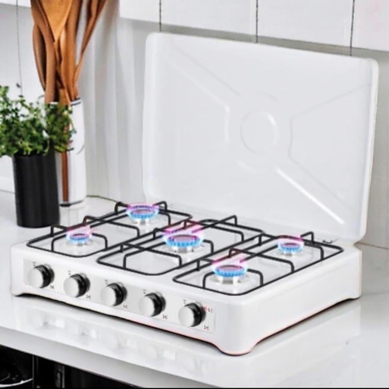 موقد غاز بخمس عيون الجديد، عملي وقوي للطهي السريع، تصميم متين يضمن توزيع حرارة متساوي، مثالي للمطابخ المنزلية والاحتياجات اليومية للطهي.